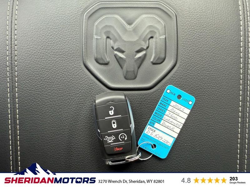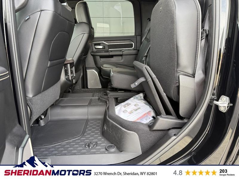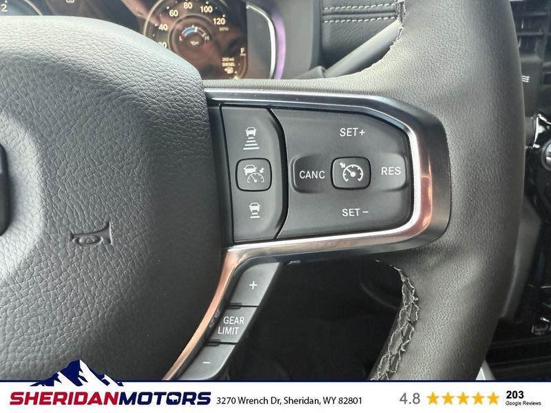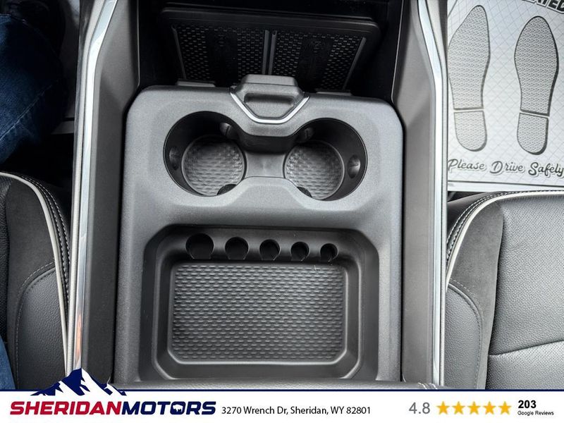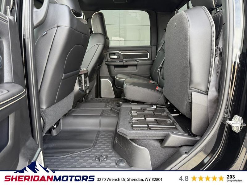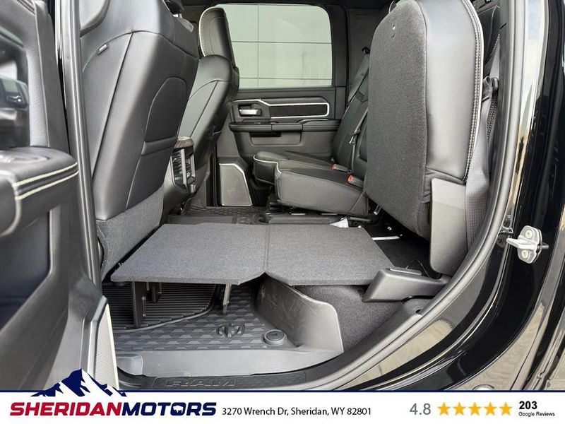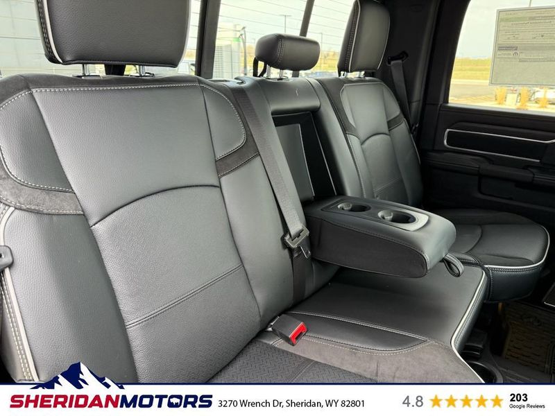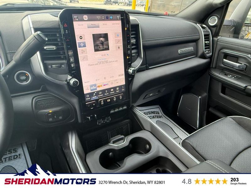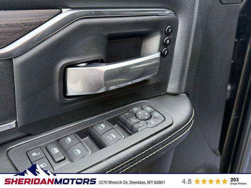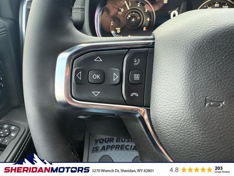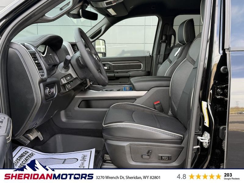 Cold Weather Group: Engine Block Heater; MOPAR Winter Front Grille Cover. Laramie Level 2 Plus Equipment Group: Google Android Auto; SiriusXM Radio Service; Power Adjustable Pedals with Memory; For Details Visit DriveUconnect.com; For More Info. Call 800-643-2112; Integrated Voice Command with Bluetooth; Emergency Vehicle Alert System (EVAS); Power Deployable Running Boards; Auto Power-Folding Mirrors; Mirror Running Lights; Drowsy Driver Detection; MOPAR Deployable Bed Step; Alexa Built-In; Apple CarPlay; Power-Adjustable Convex Aux Mirrors; Active Lane Management System; Forward and Reverse Utility Lights; Disassociated Touchscreen Display; Remote Tailgate Release; 17 Speaker Harman/kardon Premium Sound; #1 Seat Foam Cushion; 2nd Row in Floor Storage Bins; Center Stop Lamp with Cargo View Camera; Rain Sensitive Windshield Wipers; LED Bed Lighting; Traffic Sign Recognition; Connectivity - US/Canada; GPS Navigation; 4G LTE Wi-Fi Hot Spot; Adaptive Steering System; GPS Antenna Input; Exterior Mirrors with Heating Element; Auto Dimming Exterior Mirrors; SiriusXM with 360L; Global Telematics Box Module; Connected Travel and Traffic Services; Foam Bottle Insert (door Trim Panel); Off-Road Information Pages; Selectable Tire Fill Alert; Trailer Tow Pages; Leather Trimmed Bucket Seats; HD Radio; 14.4" Touchscreen Display; Power Heat Fold Memory Telescopic Mirrors; Exterior Mirrors with Supplemental Signals; Exterior Mirrors Courtesy Lamps; Uconnect 5 Nav with 14.4" Display; MOPAR Spray in Bedliner; Auto High Beam Headlamp Control; Chrome Exterior Mirrors; Exterior Mirrors with Memory; Power Adjust Mirrors; Power Telescoping Mirrors; Auto Dimming Exterior Passenger Mirror; Auto Adjust in Reverse Exterior Mirrors. Quick Order Package 24H Laramie. Towing Technology Group: Center Stop Lamp with Cargo View Camera; Surround View Camera System; Trailer Tire Pressure Monitoring System; Trailer Reverse Guidance. Chrome Bumper Package: Bright Rear Bumper; Bright Front Bumper. Power Deployable Running Boards. Leather Trimmed Bucket Seats. Center Stop Lamp with Cargo View Camera. 50 Gallon Fuel Tank. Instrument Panel Mounted Auxiliary Switches. Diamond Black Crystal PC. MOPAR Front and Rear Rubber Floor Mats. Transfer Case Skid Plate Shield. **Equipment listed is based on original vehicle build and subject to change. Please confirm the accuracy of the included equipment by calling the dealer prior to purchase.**