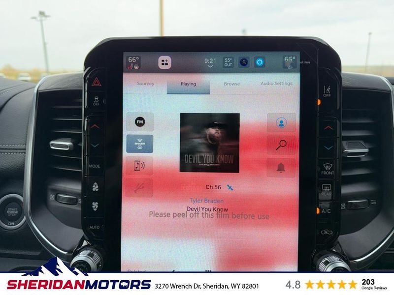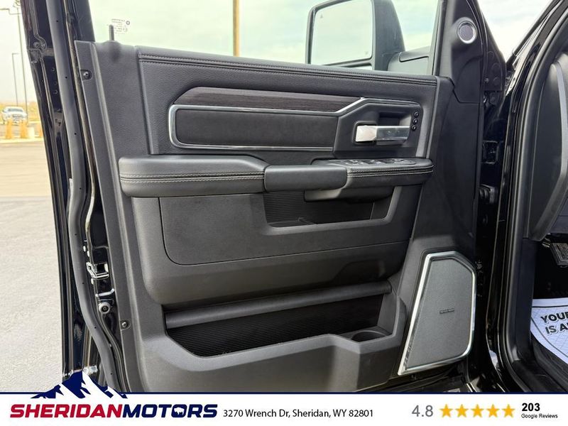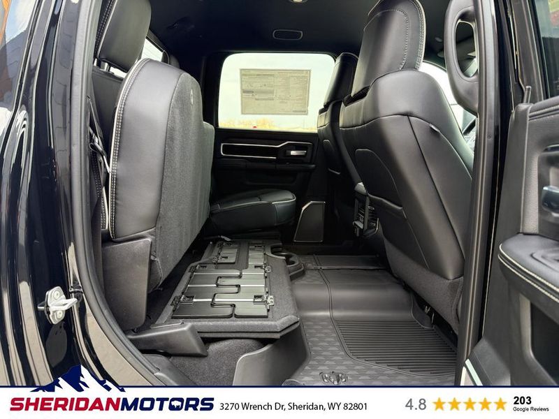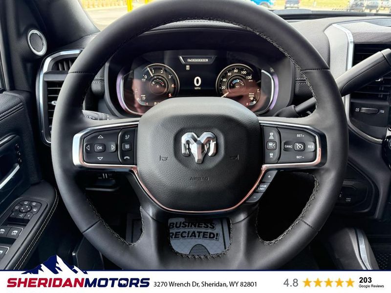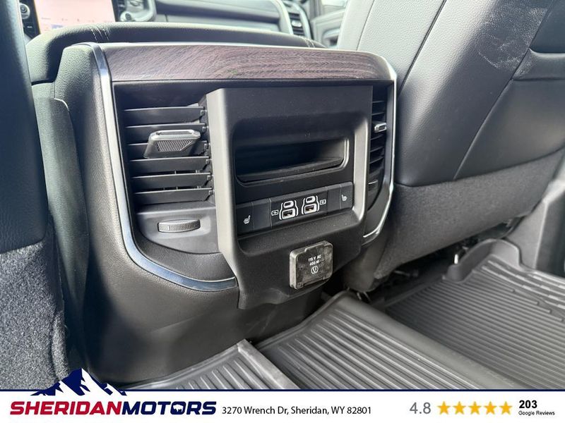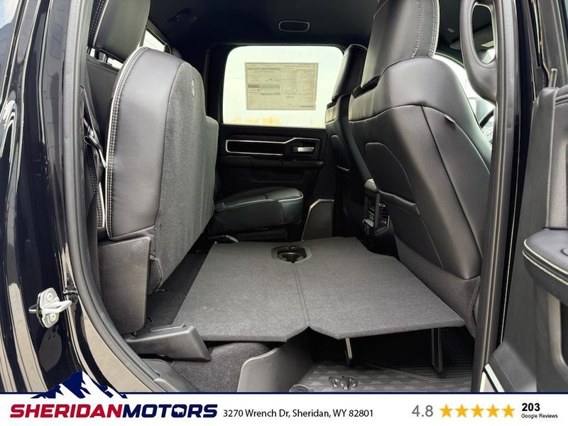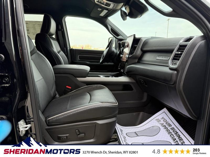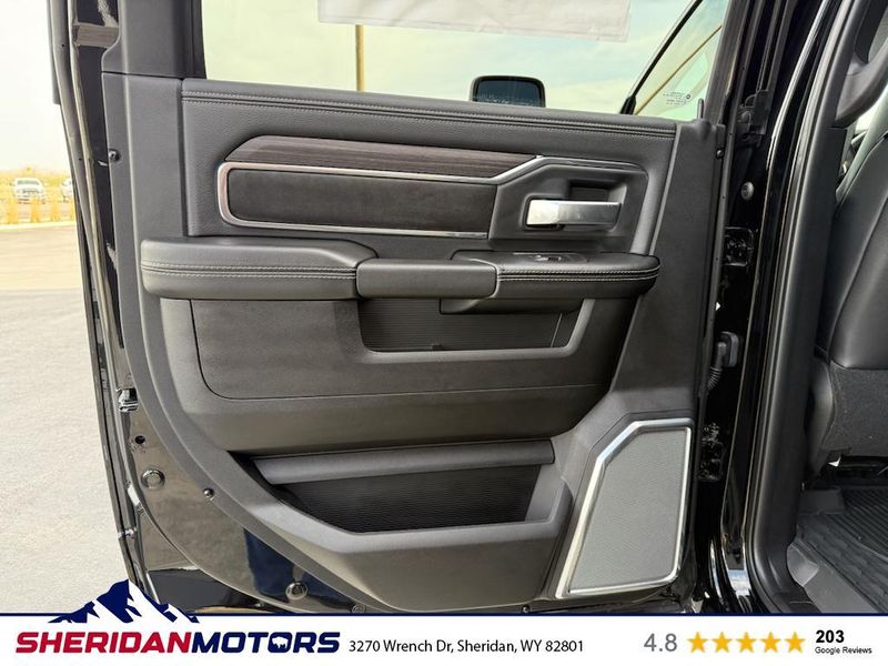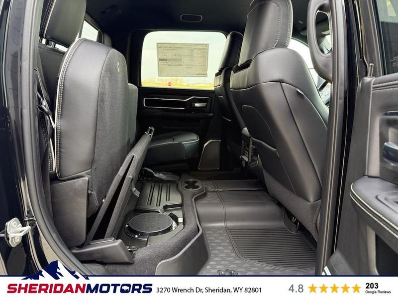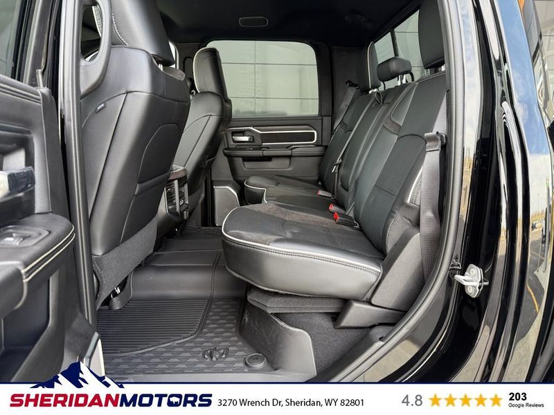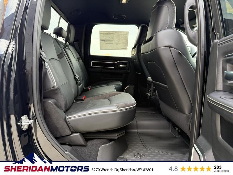 Cold Weather Group: Engine Block Heater; MOPAR Winter Front Grille Cover. Laramie Level 2 Plus Equipment Group: Google Android Auto; SiriusXM Radio Service; Power Adjustable Pedals with Memory; For Details Visit DriveUconnect.com; For More Info. Call 800-643-2112; Integrated Voice Command with Bluetooth; Emergency Vehicle Alert System (EVAS); Power Deployable Running Boards; Auto Power-Folding Mirrors; Mirror Running Lights; Drowsy Driver Detection; MOPAR Deployable Bed Step; Alexa Built-In; Apple CarPlay; Power-Adjustable Convex Aux Mirrors; Active Lane Management System; Forward and Reverse Utility Lights; Disassociated Touchscreen Display; Remote Tailgate Release; 17 Speaker Harman/kardon Premium Sound; #1 Seat Foam Cushion; 2nd Row in Floor Storage Bins; Center Stop Lamp with Cargo View Camera; Rain Sensitive Windshield Wipers; LED Bed Lighting; Traffic Sign Recognition; Connectivity - US/Canada; GPS Navigation; 4G LTE Wi-Fi Hot Spot; Adaptive Steering System; GPS Antenna Input; Exterior Mirrors with Heating Element; Auto Dimming Exterior Mirrors; SiriusXM with 360L; Global Telematics Box Module; Connected Travel and Traffic Services; Foam Bottle Insert (door Trim Panel); Off-Road Information Pages; Selectable Tire Fill Alert; Trailer Tow Pages; Leather Trimmed Bucket Seats; HD Radio; 14.4" Touchscreen Display; Power Heat Fold Memory Telescopic Mirrors; Exterior Mirrors with Supplemental Signals; Exterior Mirrors Courtesy Lamps; Uconnect 5 Nav with 14.4" Display; MOPAR Spray in Bedliner; Auto High Beam Headlamp Control; Chrome Exterior Mirrors; Exterior Mirrors with Memory; Power Adjust Mirrors; Power Telescoping Mirrors; Auto Dimming Exterior Passenger Mirror; Auto Adjust in Reverse Exterior Mirrors. Quick Order Package 24H Laramie. Towing Technology Group: Center Stop Lamp with Cargo View Camera; Surround View Camera System; Trailer Tire Pressure Monitoring System; Trailer Reverse Guidance. Chrome Bumper Package: Bright Rear Bumper; Bright Front Bumper. Power Deployable Running Boards. Leather Trimmed Bucket Seats. Center Stop Lamp with Cargo View Camera. 50 Gallon Fuel Tank. Instrument Panel Mounted Auxiliary Switches. Diamond Black Crystal PC. MOPAR Front and Rear Rubber Floor Mats. Transfer Case Skid Plate Shield. **Equipment listed is based on original vehicle build and subject to change. Please confirm the accuracy of the included equipment by calling the dealer prior to purchase.**