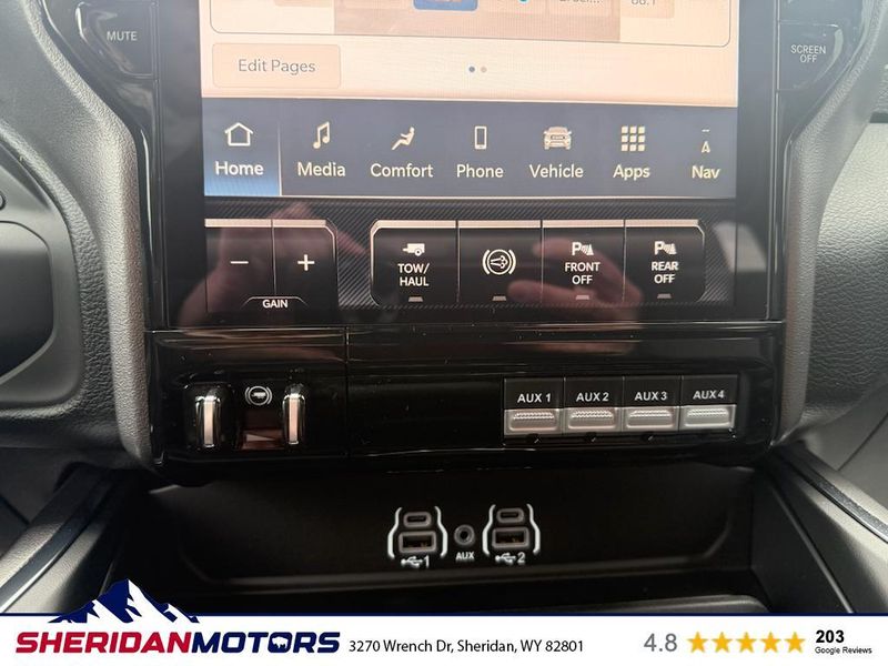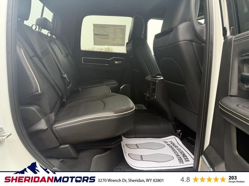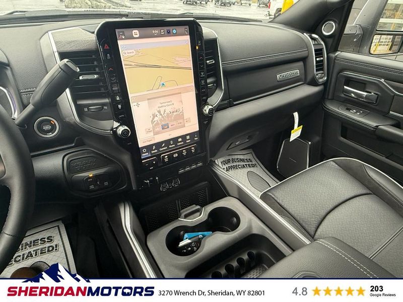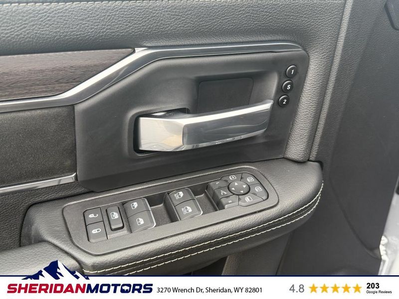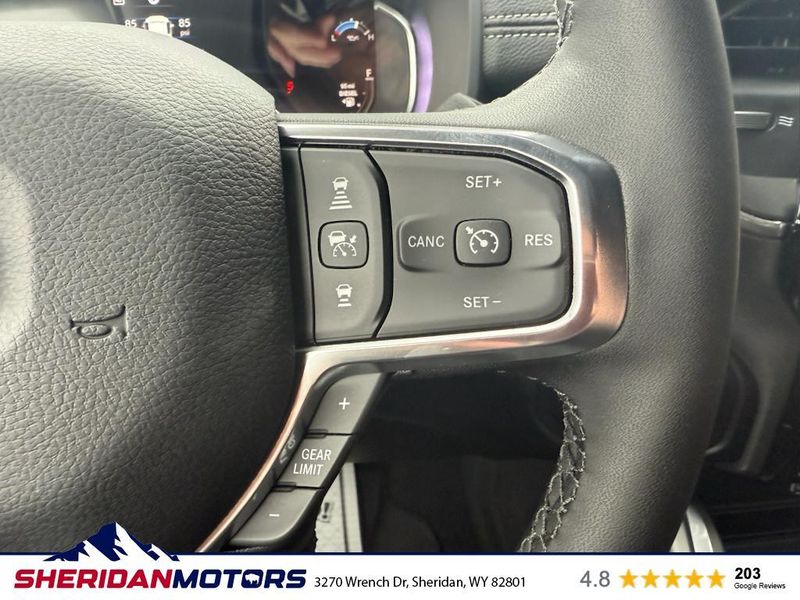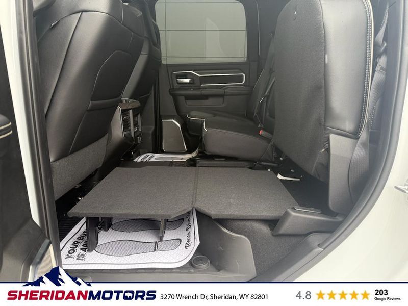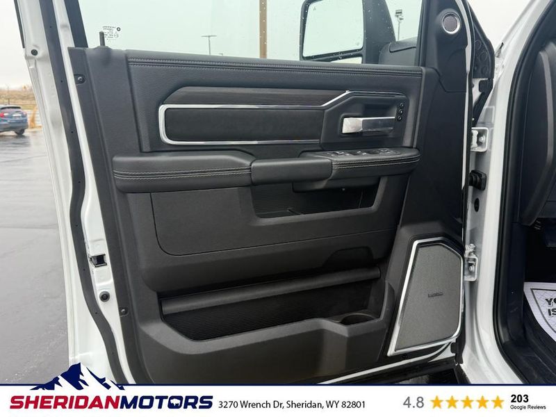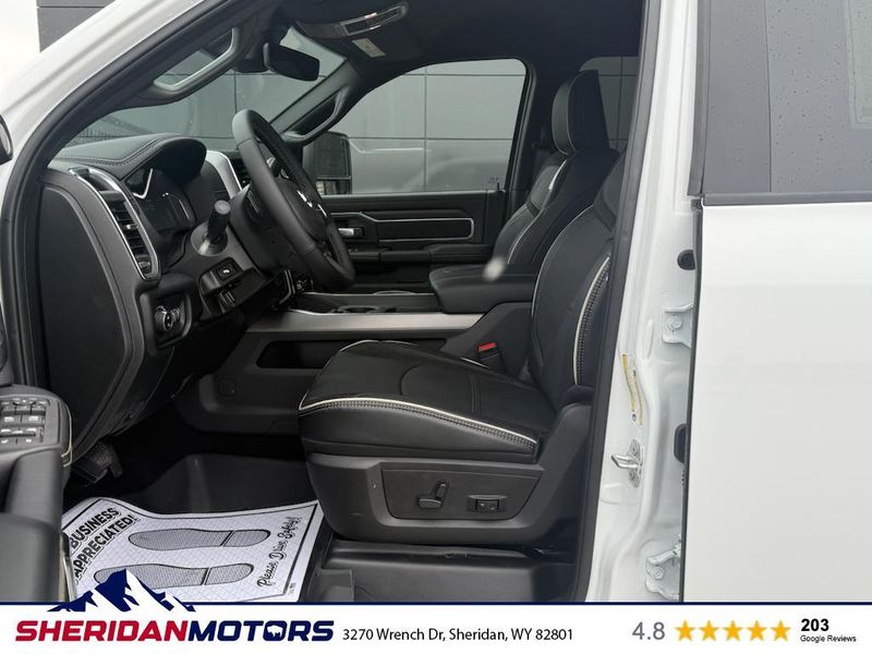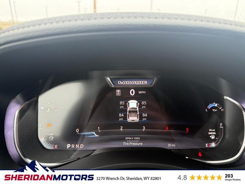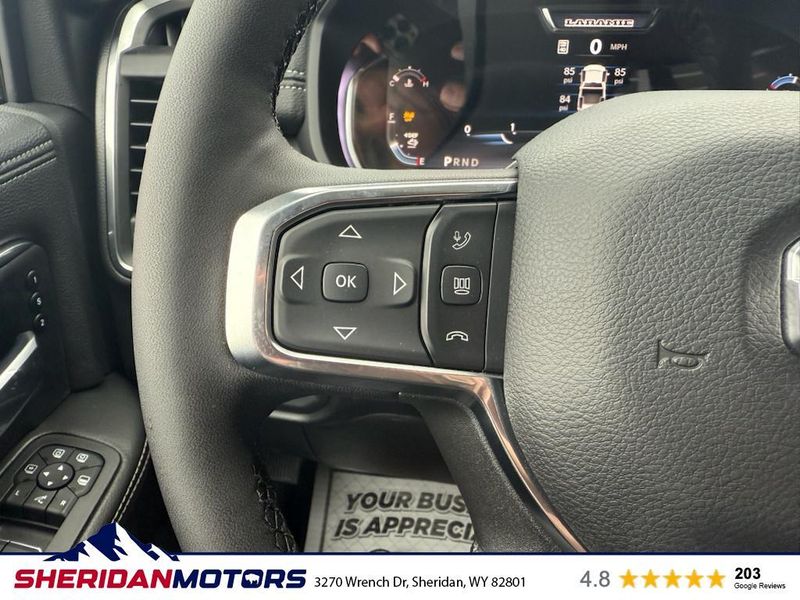 Cold Weather Group: Engine Block Heater; MOPAR Winter Front Grille Cover. Laramie Level 2 Plus Equipment Group: Google Android Auto; SiriusXM Radio Service; Power Adjustable Pedals with Memory; For Details Visit DriveUconnect.com; For More Info. Call 800-643-2112; Integrated Voice Command with Bluetooth; Emergency Vehicle Alert System (EVAS); Power Deployable Running Boards; Auto Power-Folding Mirrors; Mirror Running Lights; Drowsy Driver Detection; MOPAR Deployable Bed Step; Alexa Built-In; Apple CarPlay; Power-Adjustable Convex Aux Mirrors; Active Lane Management System; Forward and Reverse Utility Lights; Disassociated Touchscreen Display; Remote Tailgate Release; 17 Speaker Harman/kardon Premium Sound; #1 Seat Foam Cushion; 2nd Row in Floor Storage Bins; Center Stop Lamp with Cargo View Camera; Rain Sensitive Windshield Wipers; LED Bed Lighting; Traffic Sign Recognition; Connectivity - US/Canada; GPS Navigation; 4G LTE Wi-Fi Hot Spot; Adaptive Steering System; GPS Antenna Input; Exterior Mirrors with Heating Element; Auto Dimming Exterior Mirrors; SiriusXM with 360L; Global Telematics Box Module; Connected Travel and Traffic Services; Foam Bottle Insert (door Trim Panel); Off-Road Information Pages; Selectable Tire Fill Alert; Trailer Tow Pages; Leather Trimmed Bucket Seats; HD Radio; 14.4" Touchscreen Display; Power Heat Fold Memory Telescopic Mirrors; Exterior Mirrors with Supplemental Signals; Exterior Mirrors Courtesy Lamps; Uconnect 5 Nav with 14.4" Display; MOPAR Spray in Bedliner; Auto High Beam Headlamp Control; Chrome Exterior Mirrors; Exterior Mirrors with Memory; Power Adjust Mirrors; Power Telescoping Mirrors; Auto Dimming Exterior Passenger Mirror; Auto Adjust in Reverse Exterior Mirrors. Quick Order Package 24H Laramie. Towing Technology Group: Center Stop Lamp with Cargo View Camera; Surround View Camera System; Trailer Tire Pressure Monitoring System; Trailer Reverse Guidance. Chrome Bumper Package: Bright Rear Bumper; Bright Front Bumper. Power Deployable Running Boards. Leather Trimmed Bucket Seats. Center Stop Lamp with Cargo View Camera. 50 Gallon Fuel Tank. Instrument Panel Mounted Auxiliary Switches. MOPAR Front and Rear Rubber Floor Mats. Transfer Case Skid Plate Shield. **Equipment listed is based on original vehicle build and subject to change. Please confirm the accuracy of the included equipment by calling the dealer prior to purchase.**