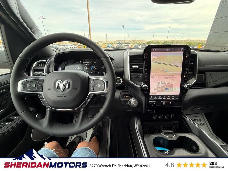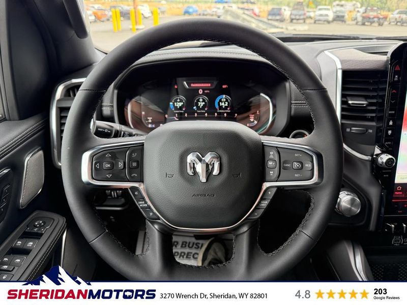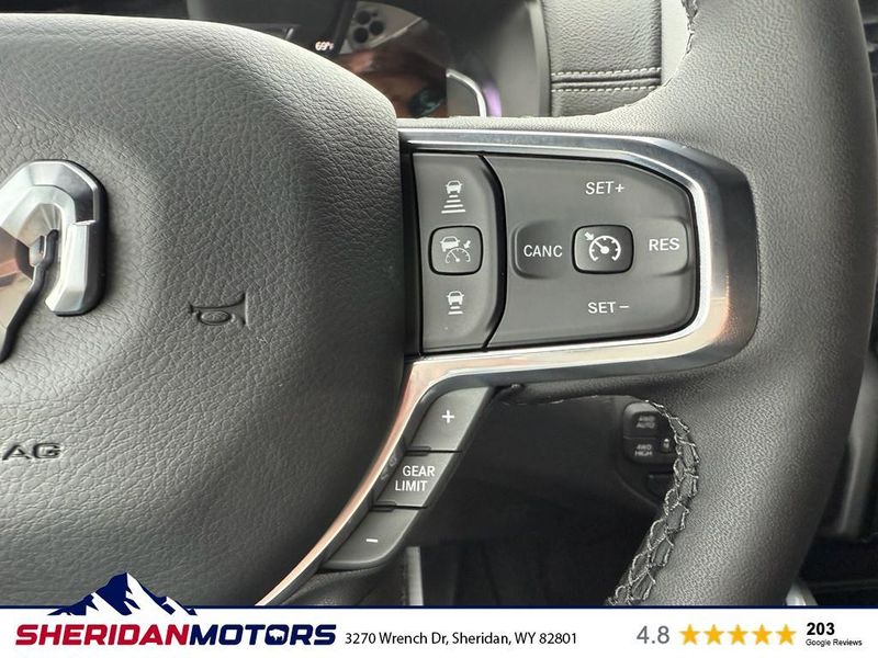 This vehicle's Forward Collision Warning feature alerts drivers to potential front-end collisions. See what's behind you with the back up camera on this 1/2 ton pickup. You'll never again be lost in a crowded city or a country region with the navigation system on this unit. This 1/2 ton pickup features a hands-free Bluetooth phone system. Start it from inside with remote start. This 1/2 ton pickup has a premium sound system installed. The leather seats in the Ram 1500 are a must for buyers looking for comfort, durability, and style. This 1/2 ton pickup has automated speed control that adjusts to maintain a safe following distance, enhancing highway driving convenience. This 1/2 ton pickup offers Android Auto for seamless smartphone integration. The Ram 1500 is pure luxury with a heated steering wheel. Apple CarPlay: Seamless smartphone integration for the Ram 1500 - stay connected and entertained on the go!